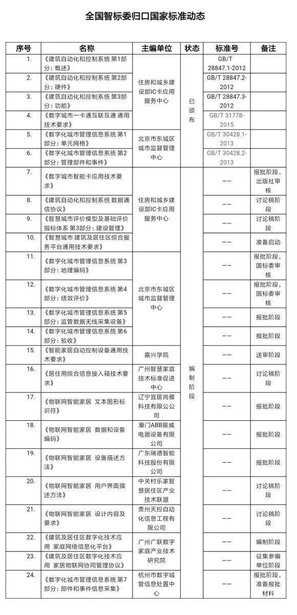 全國智能建筑及居住區數字化標準化技術委員會(SAC/TC426)(簡稱“全國智標委”)。全國智標委于2008年由國家標準化管理委員會批準(國標委綜合[2008]108號)成立,由住房和城鄉建設部負責業務指導的技術標準組織。全國智標委作為城市建設領域信息化產品標準國內唯一歸口單位,主要負責智能建筑物數字化系統領域國家標準的制修訂工作,其工作領域與國際標準化組織建筑物環境設計技術委員會建筑物控制系統設計工作組(ISO/TC205/WG3)相關聯。主要圍繞智慧城市、智慧社區、數字城管、智能家居等方面開展關鍵技術標準研究、歸口管理及應用示范推廣工作。