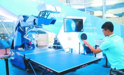 一名工作人員在2018世界人工智能大會上演示與機(jī)器人打乒乓球。