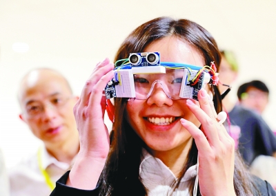 上海交大學(xué)生在展示為視障人士研發(fā)的具有導(dǎo)盲功能的眼鏡控制系統(tǒng)。
